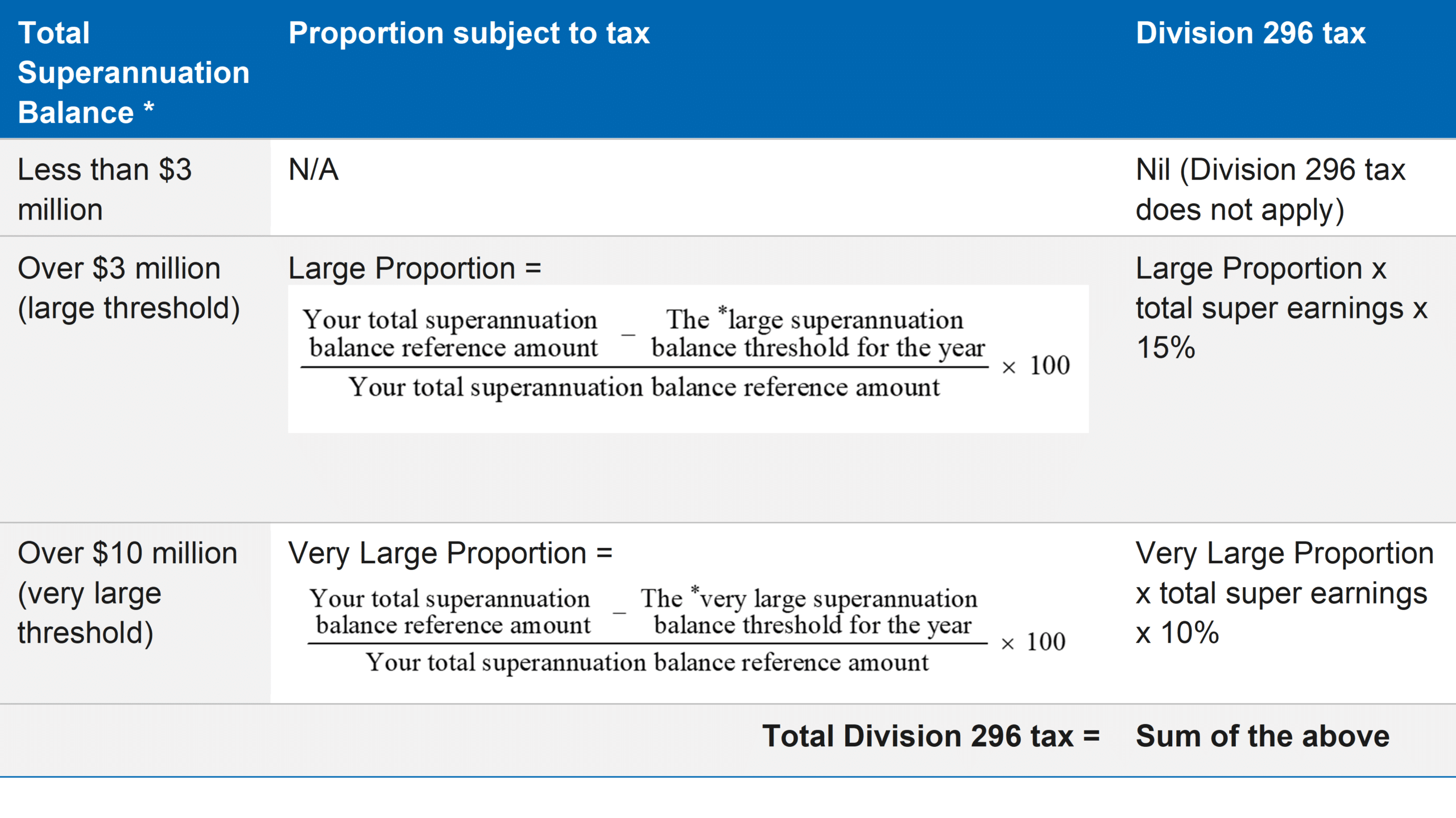The rate of Division 296 tax is applied on the proportion of earnings that relate to a member’s total superannuation balance above the respective large or very large superannuation thresholds.