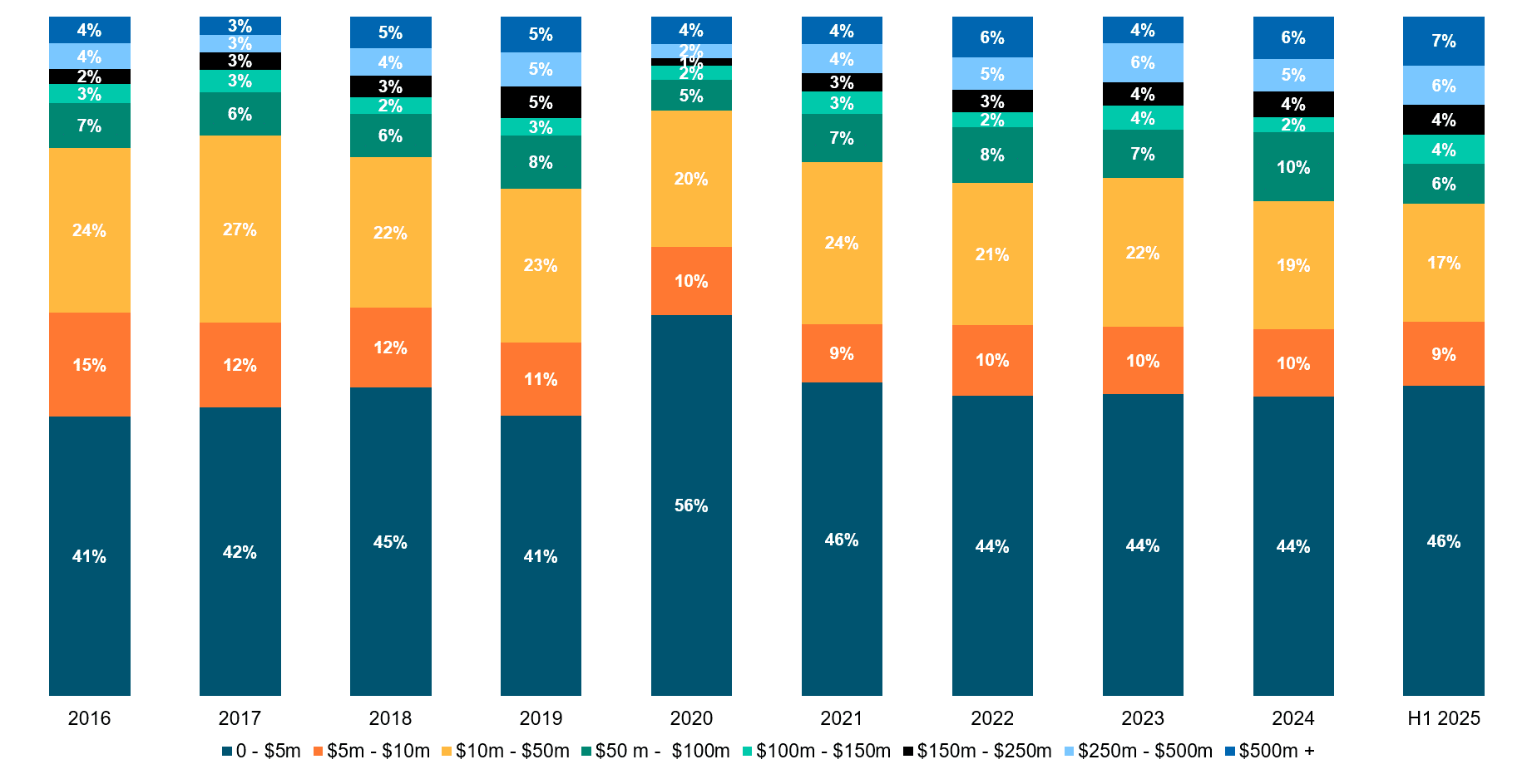 Breakdown of M&A Activity per transaction size category in Australia (2016-1H2025) (% of total # of transactions)