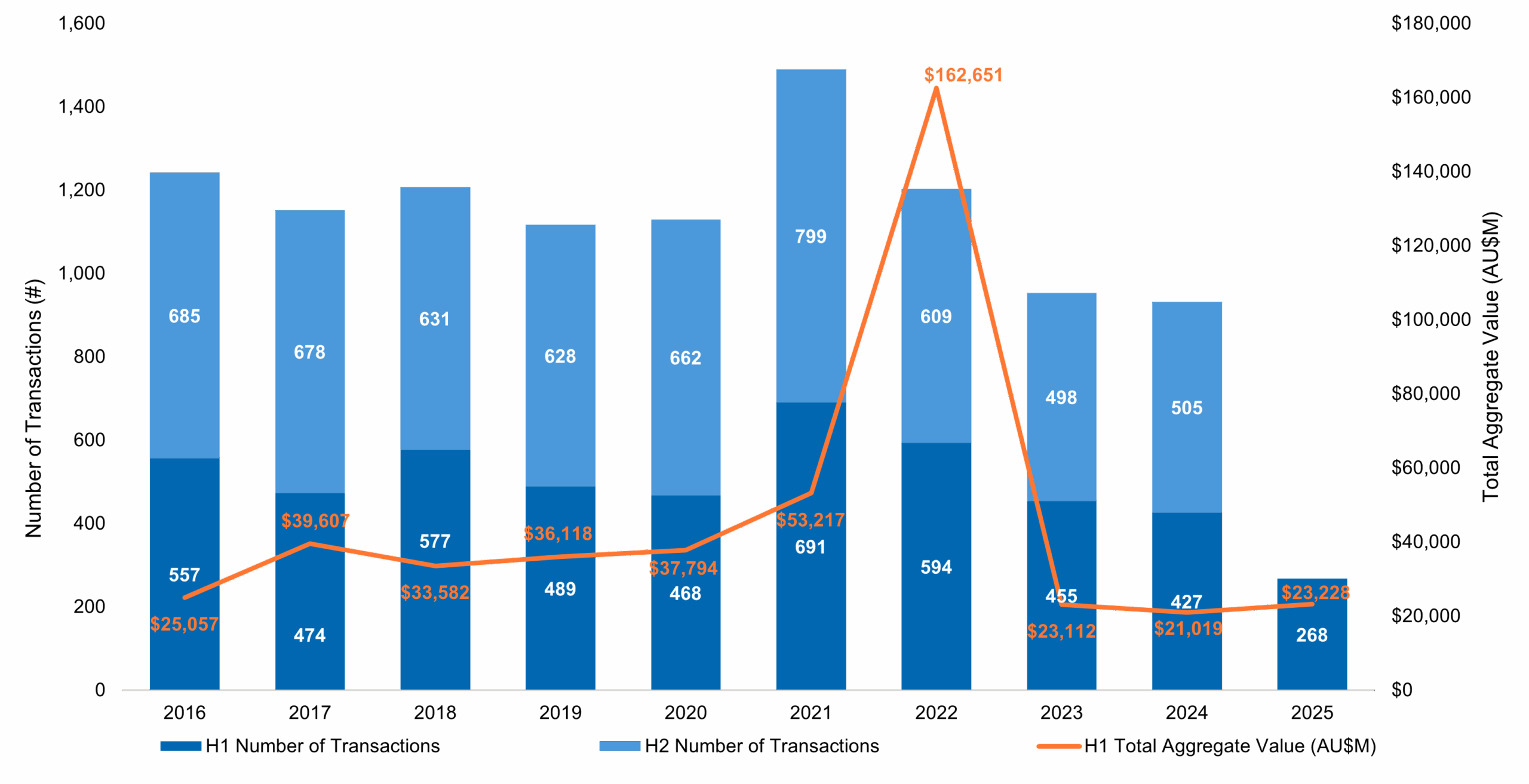 Aggregate value and number of transactions in Australia (2016-1H2025)
