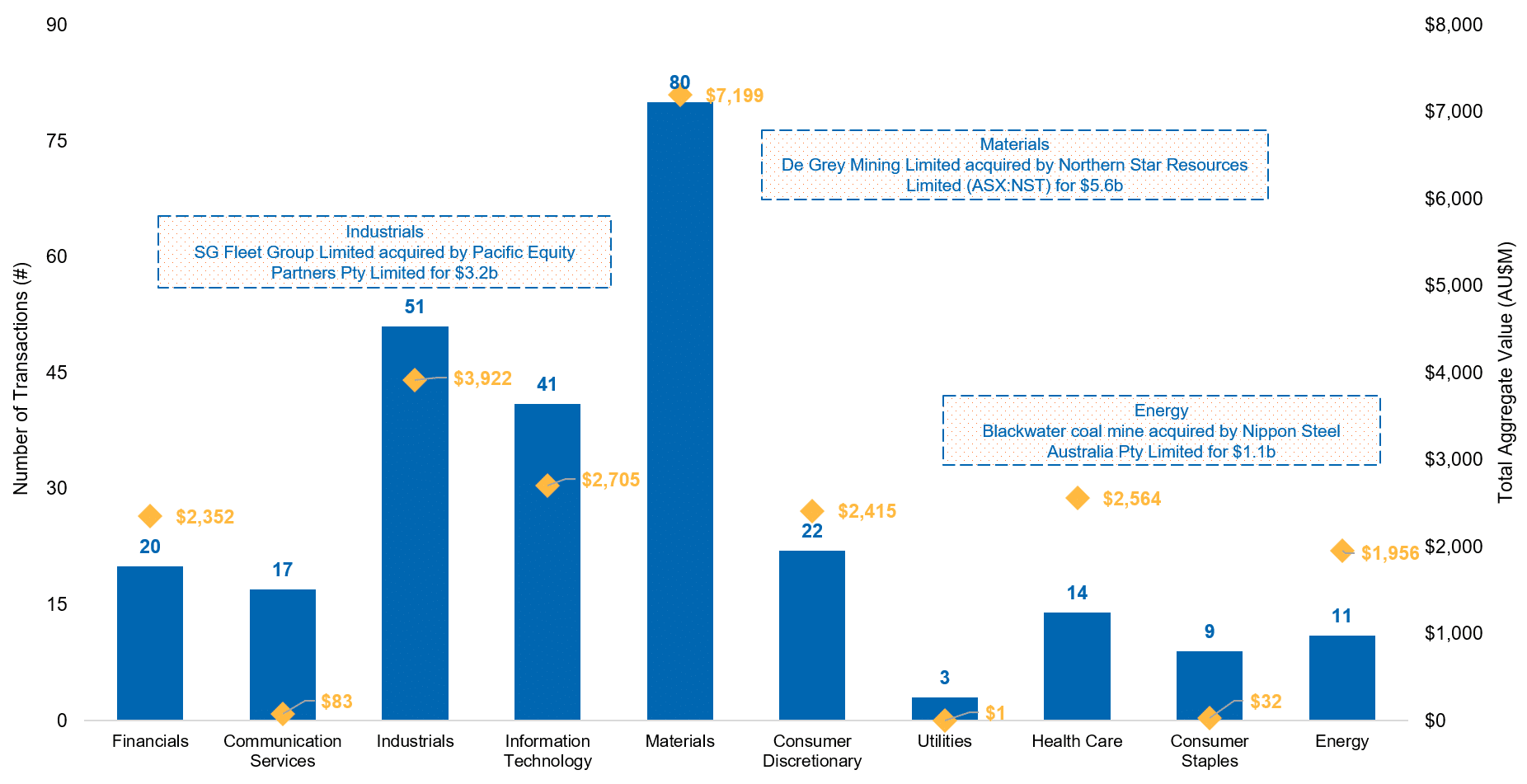 Businesses in the materials sector dominated M&A activity with 80 deals and $7.2b in disclosed aggregate deal value. Northern Star Resources Limited’s acquisition of De Grey Mining Ltd for $5.6b was a significant driver of this sector’s outperformance.