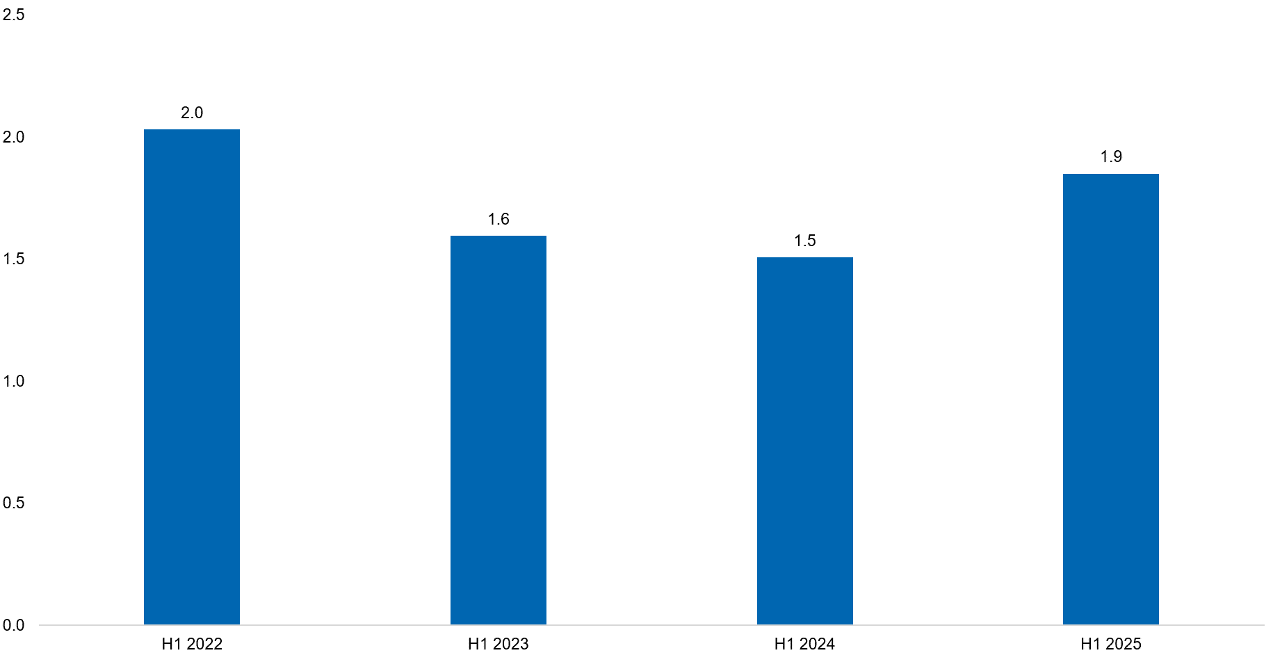 Global M&A activity has rebounded, compared to both H1 2023 and 2024. Transaction values were $1.9 trillion in H1 2025, an increase of 27% from the previous corresponding period (pcp). Higher value deals saw Europe grow from 22% to 25% pcp and Asia-Pacific expand from 13% to 20% pcp. Simultaneously, the United States saw a decline in activity by value from 61% of global market share to 52%, which is in line with its historical average. Part of this decline is explained by the uncertainty around the 2 April ‘Liberation Day’ tariffs, which likely stalled investment deal decisions.