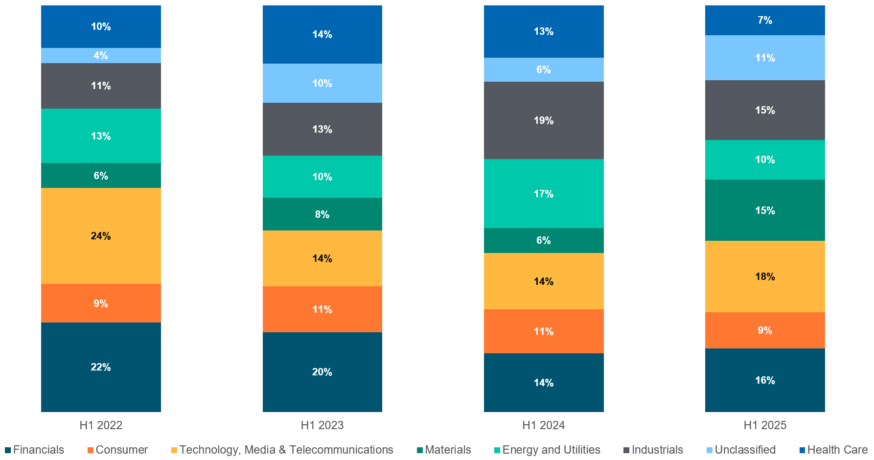 The Technology, Media and Telecom (TMT) sector has recorded a rebound in its share of transaction value, growing from 14% in H1 2023 and 2024 to 18% in H1 2025. In contrast, both Energy & Utilities and Industrials have seen a decline year-on-year from 17% to 10% and 19% to 15%, respectively.